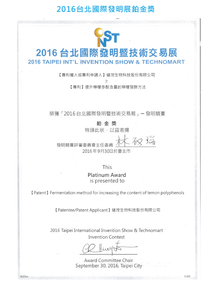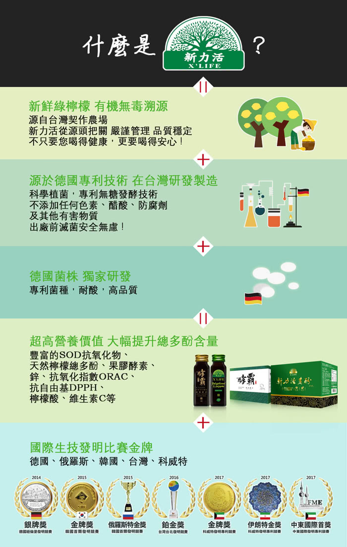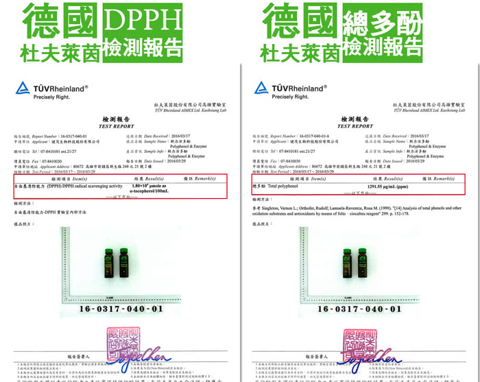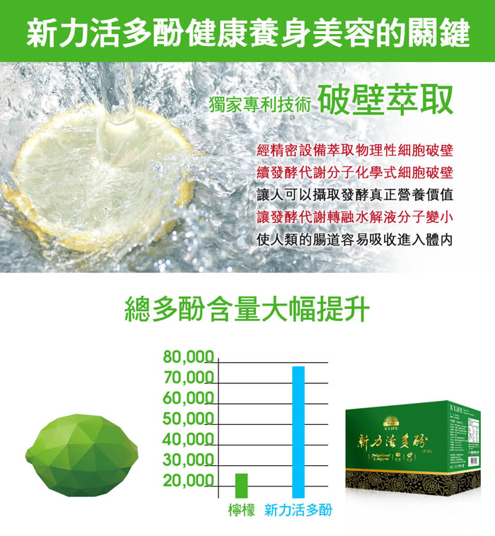 檸檬多酚:是以科學植菌發酵方式,堅持 100%採用無毒檸檬,以無糖工藝製程發酵,發酵過程無添加物,因此安全無虞,由於它是經物理與化學分子代謝的細胞破壁,再轉融小分子化,將分子量增多,達到好吸收、攝取高價值成分,有足夠劑量讓身體受益,達到維持健康的明顯療效。
