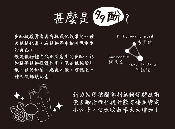 A. 多酚:是植物內天然的多酚化學分子結構,其中的維生素C具有超強的抗氧化功能,可主動捕捉與攻擊不好的東西,保護細胞避免被不好的東西氧化而失去功能。