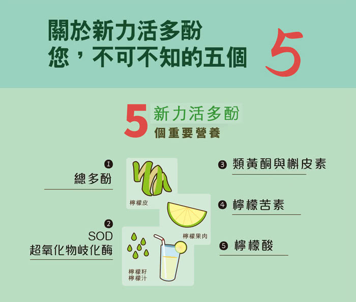 而檸檬多酚內含有豐富的植化素多酚與 SOD 酵素,可以達到調整體質、滋補強身、增強體力的目的。