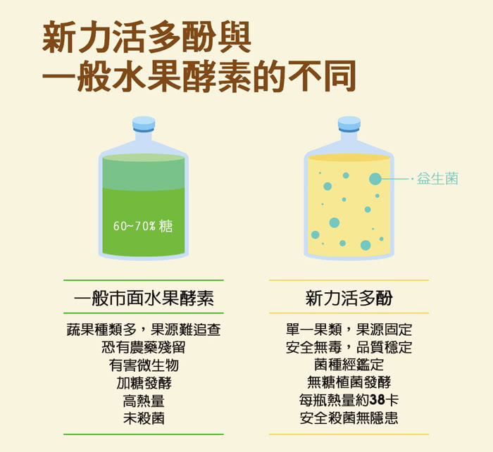 A. 有糖發酵:比較舊有的發酵,99%都是有糖發酵,它需要用 50%以上的糖量去做發酵,所以不只吃下許多高熱量,更讓糖造成心血管疾病與癌細胞營養的風險。同時它也是透過自然落菌的方式來做發酵,菌種來源不明,效用也不明,充填後也沒有做任何的殺菌動作,讓消費者把這些來源不明的菌吃下肚,會造成健康隱患。
