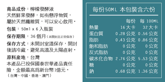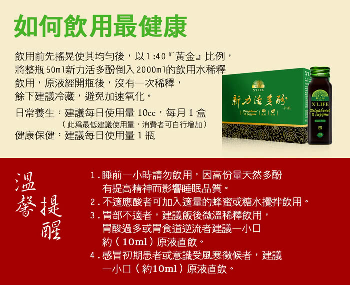 | 食用方式 | 飲用前搖晃均勻,每日建議飲用 50ml |